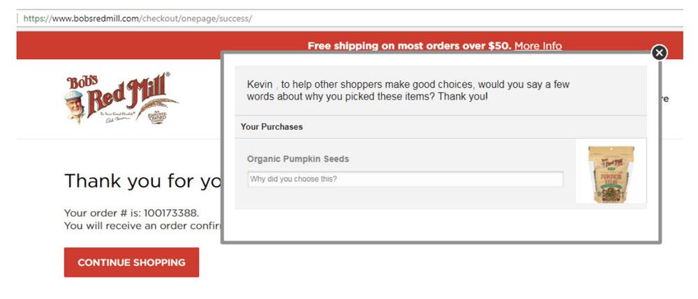 Bob’s Red Mill almost passed on integrating Emplifi’s Checkout Comments™ into their home page, something Irish says he’s immensely grateful he reversed course on. With Checkout Comments, buyers are asked a simple question about why they bought a particular item immediately after making a purchase.